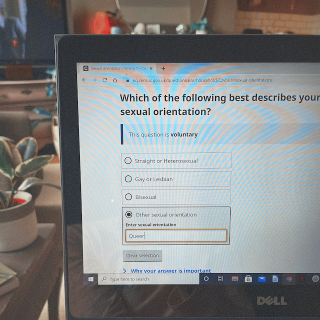 So, I recently filled in my very first Census. It was exciting, to say the least. I was baffled when I spotted it on the doormat, and did a whole 'who? me?' bit. Then it sat on my kitchen table for a few days, because despite it being lockdown and me being home ALWAYS, I still couldn't find the time to do it... you understand. When I finally got round to filling it in online, I'd already seen a fair few posts on social media about it; friends of mine were expressing astonishment and joy that there were several options for 'gender', others were annoyed there weren't more options for careers... and one of my new friends (Demi of S3x Theory with Demi) posted about the importance of writing 'queer' in the sexuality section.