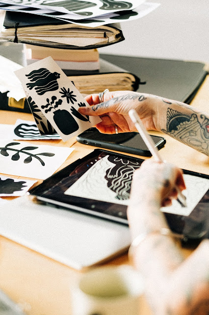 I draw all of my work with pencil, inks, paint, and also using my iPad and Procreate. I tend to lean towards using a limited colour palette of deep charcoal and beige or white, but sometimes I add in some earthy tones too.